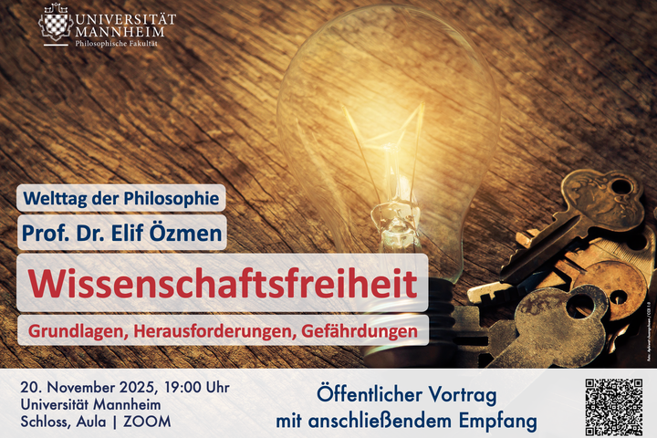 Anlässlich des UNESCO Welttags der Philosophie lud das Philosophische Seminar der Universität Mannheim zu einem öffentlichen Abendvortrag von Frau Prof. Dr. Elif Özmen am Donnerstag, den 20. November 2025, in die Aula des Mannheimer Schlosses und auf ZOOM ein. Im Anschluss fand ein Empfang in den „Katakomben“ des Mannheimer Schlosses statt.
